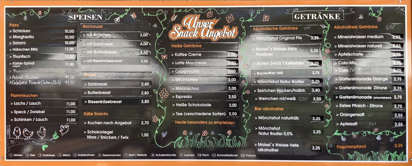 Das Angebot beinhaltet Erfrischungsgetränke, Kaffee und Kuchen, verschiedene Eissorten sowie kalte und warme Snacks.